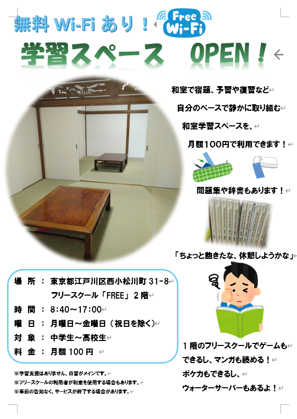 中高生向け!学習スペース【FREE】月額100円で利用できる。和室で宿題、予習や復習など、自分のペースで静かに取り組む。